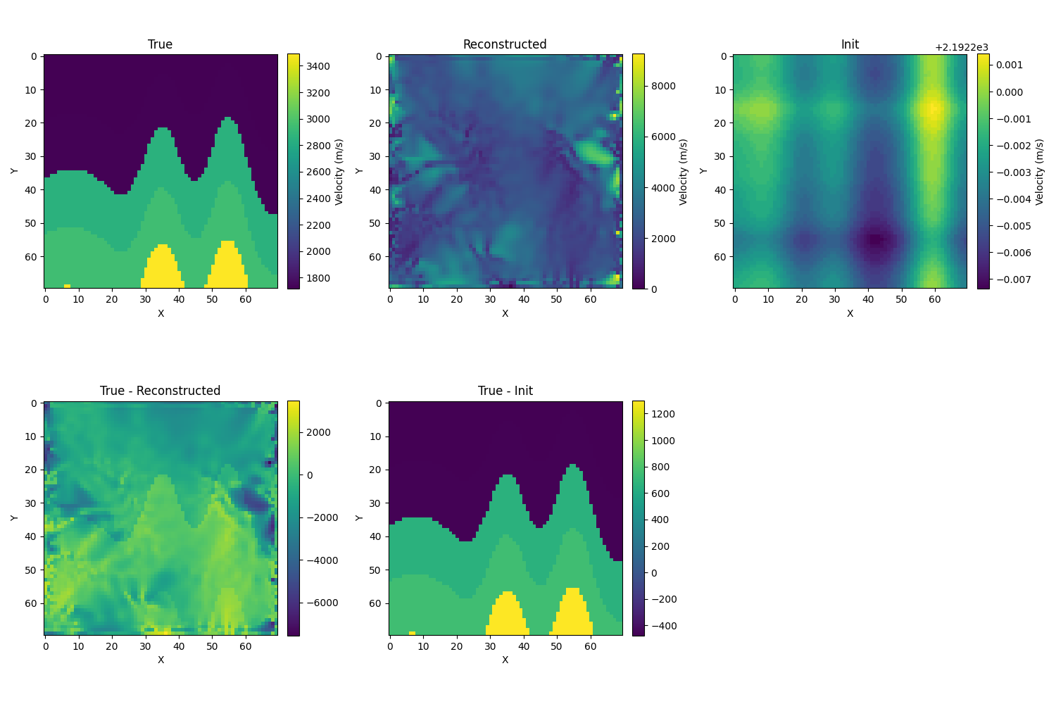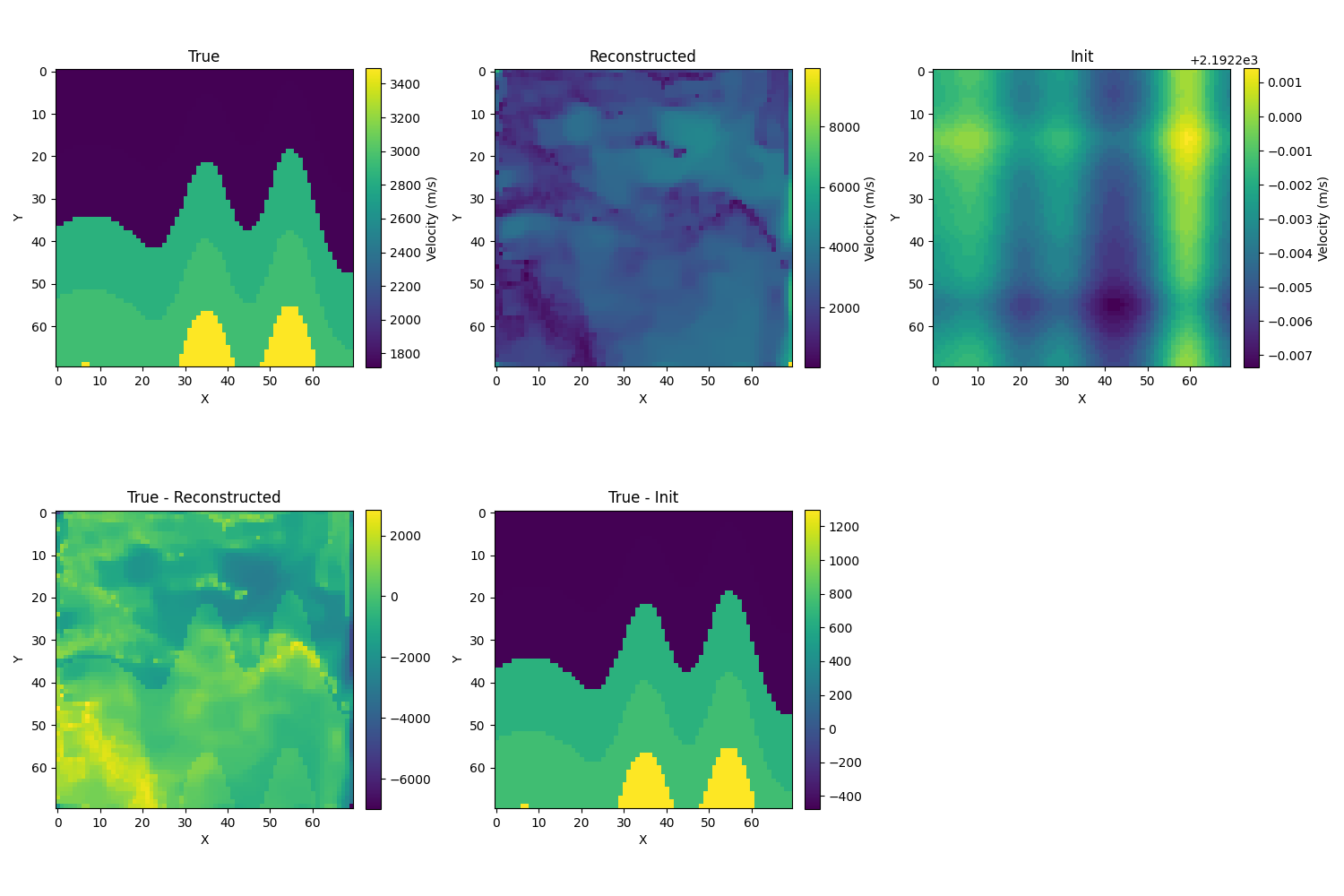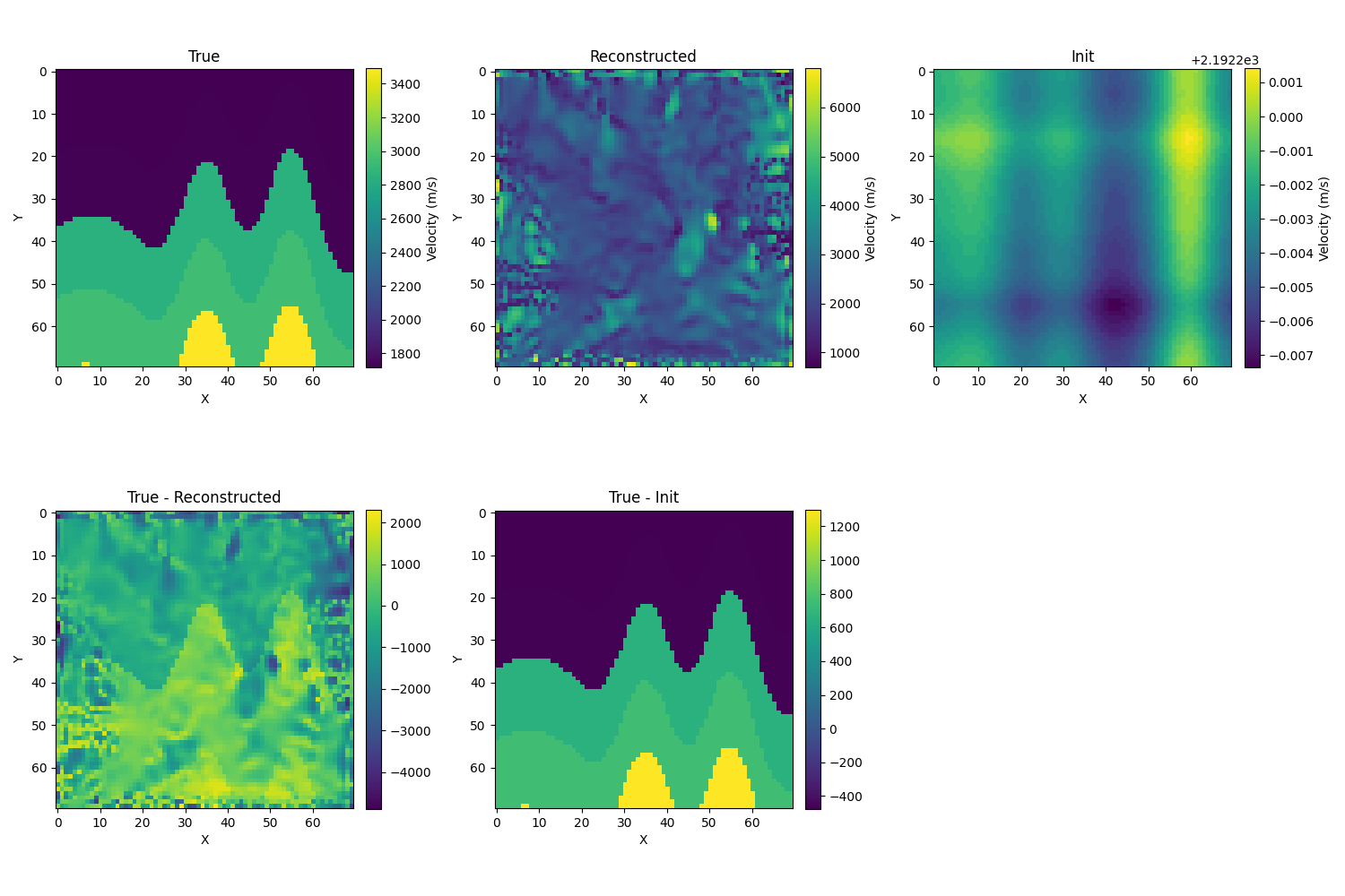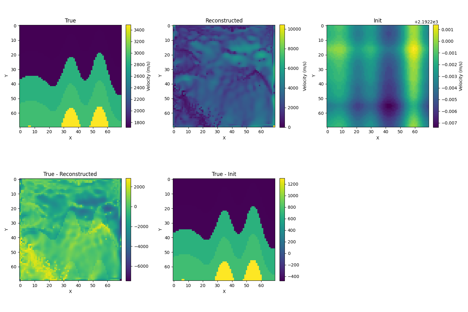 这时我们就能明显地看到半收敛性现象了(当上面的σ较大时,也会出现相对误差不降的现象)> deepwave的建议是一个完整波形的长度至少需要6个网格点,否则可能无法准确模拟波形。根据波长=速度/频率,速度太小时,波长也会相应的小,所包含的网格点也就少,所以会出现上面的问题。此时在物理上无法进行有效的模拟2. SGD:结果有点amazing,相对误差几乎不带降,也就是基本没做移动(这里我学习率设置为50),把学习率调到5000,loss开始降了,但相对误差几乎不变(应该是在局部极小点附近了)