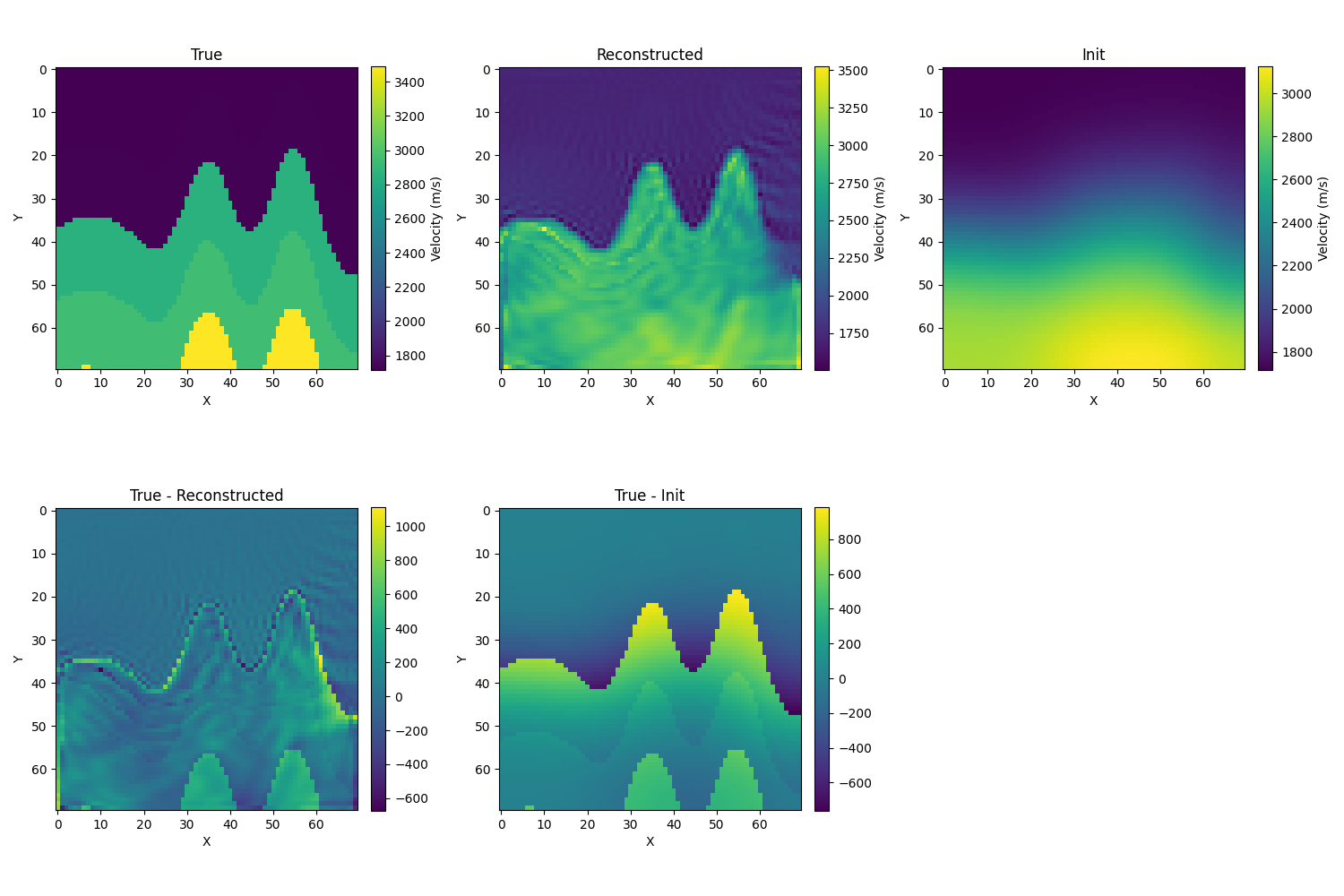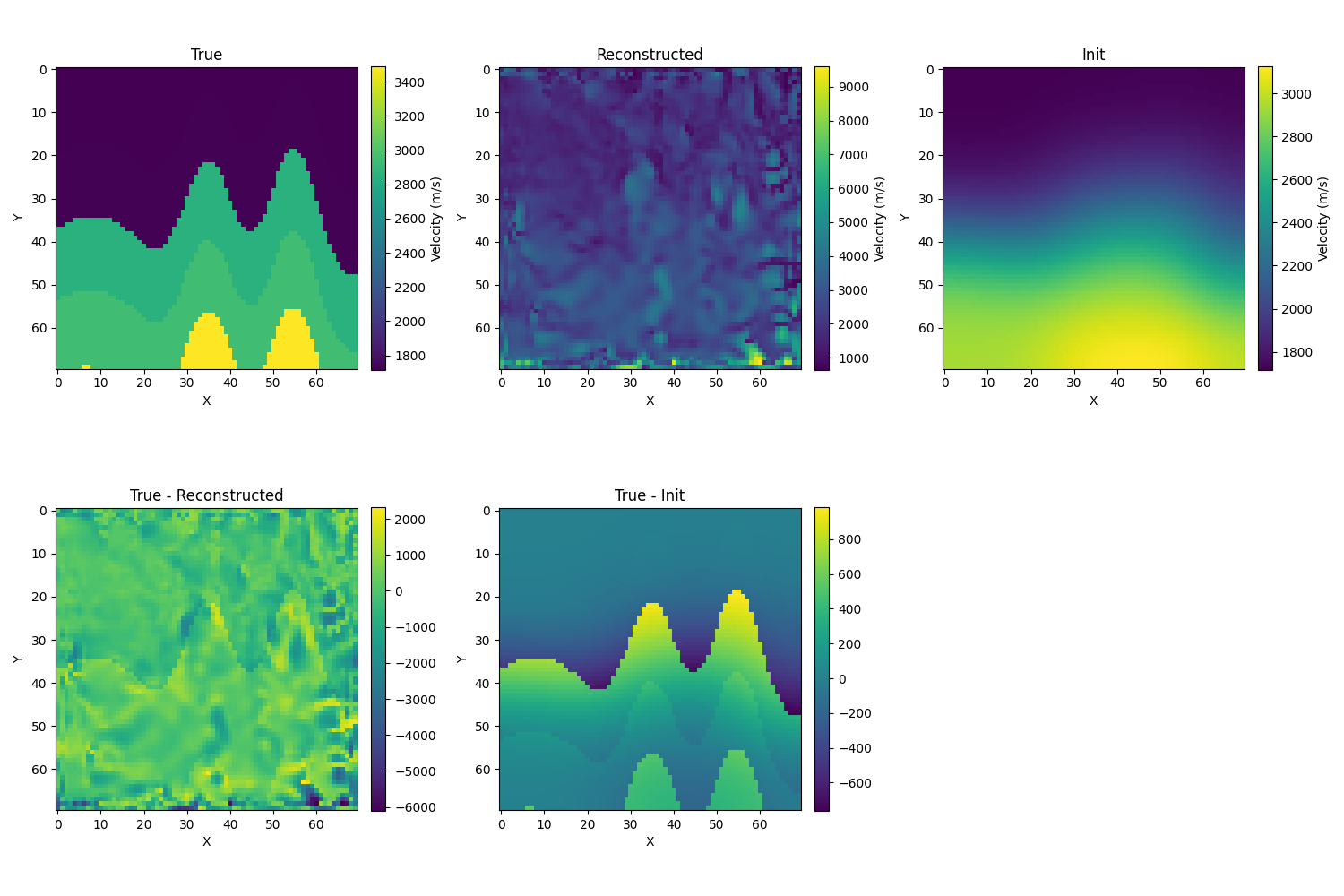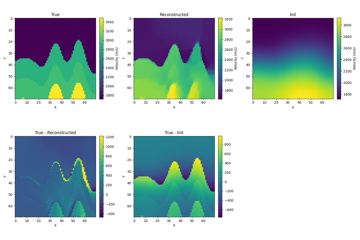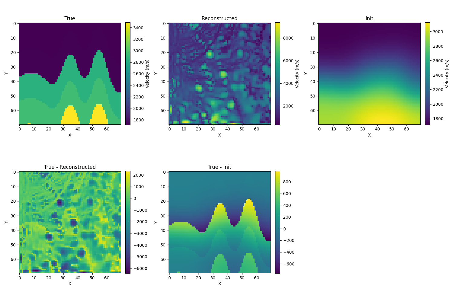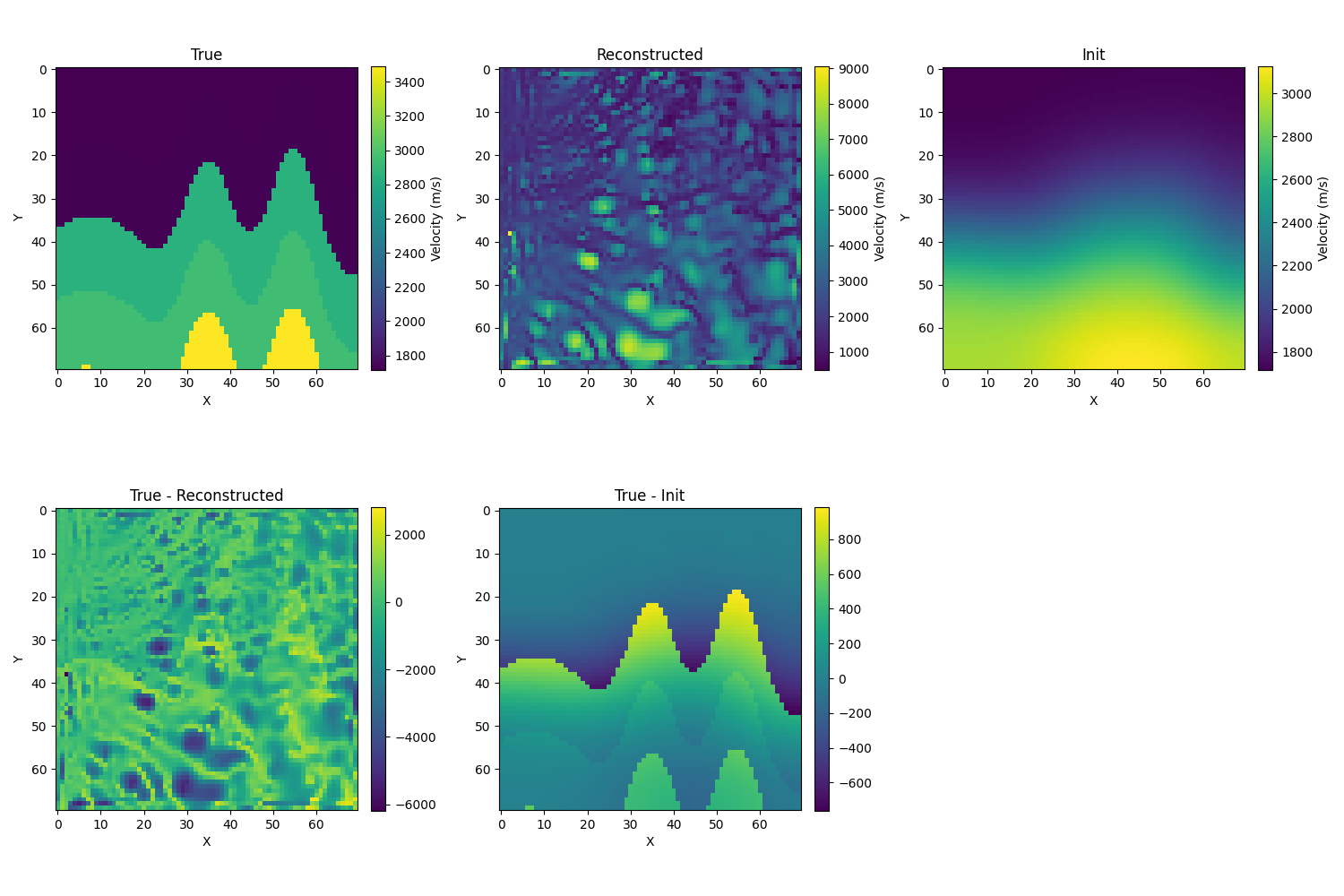 这时我们就能明显地看到半收敛性现象了(当上面的σ较大时,也会出现相对误差不降的现象)> deepwave的建议是一个完整波形的长度至少需要6个网格点,否则可能无法准确模拟波形。根据波长=速度/频率,速度太小时,波长也会相应的小,所包含的网格点也就少,所以会出现上面的问题。此时在物理上无法进行有效的模拟2. SGD:结果有点amazing,相对误差几乎不带降,也就是基本没做移动(这里我学习率设置为50),把学习率调到5000,loss开始降了,但相对误差几乎不变(应该是在局部极小点附近了)
