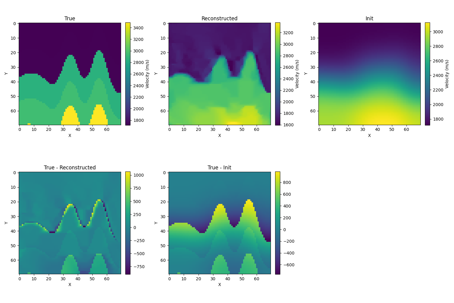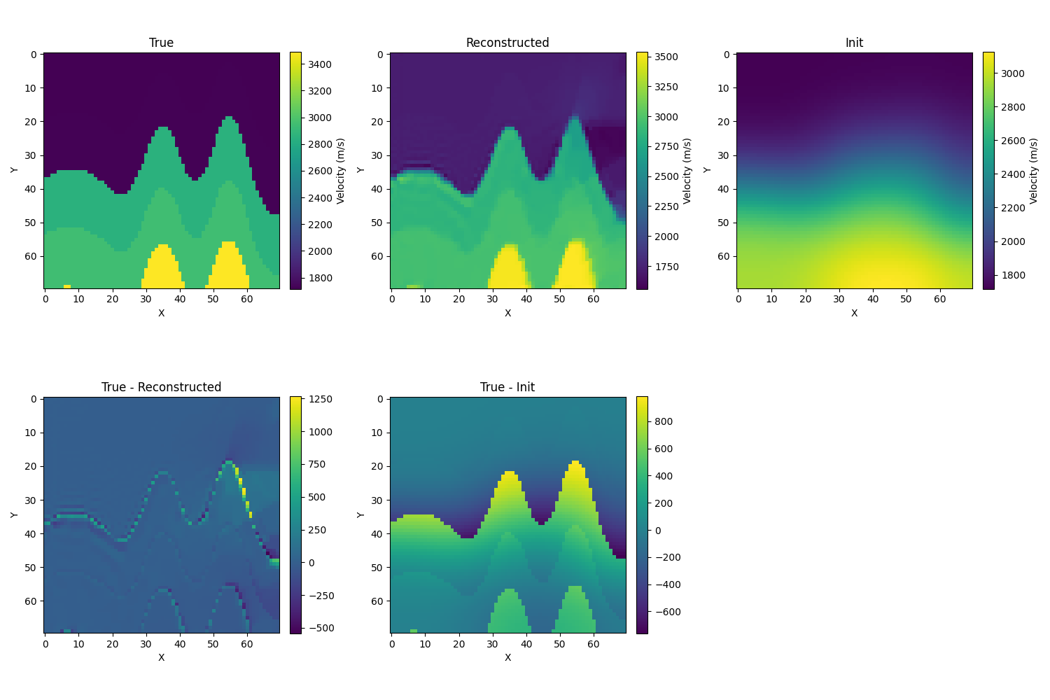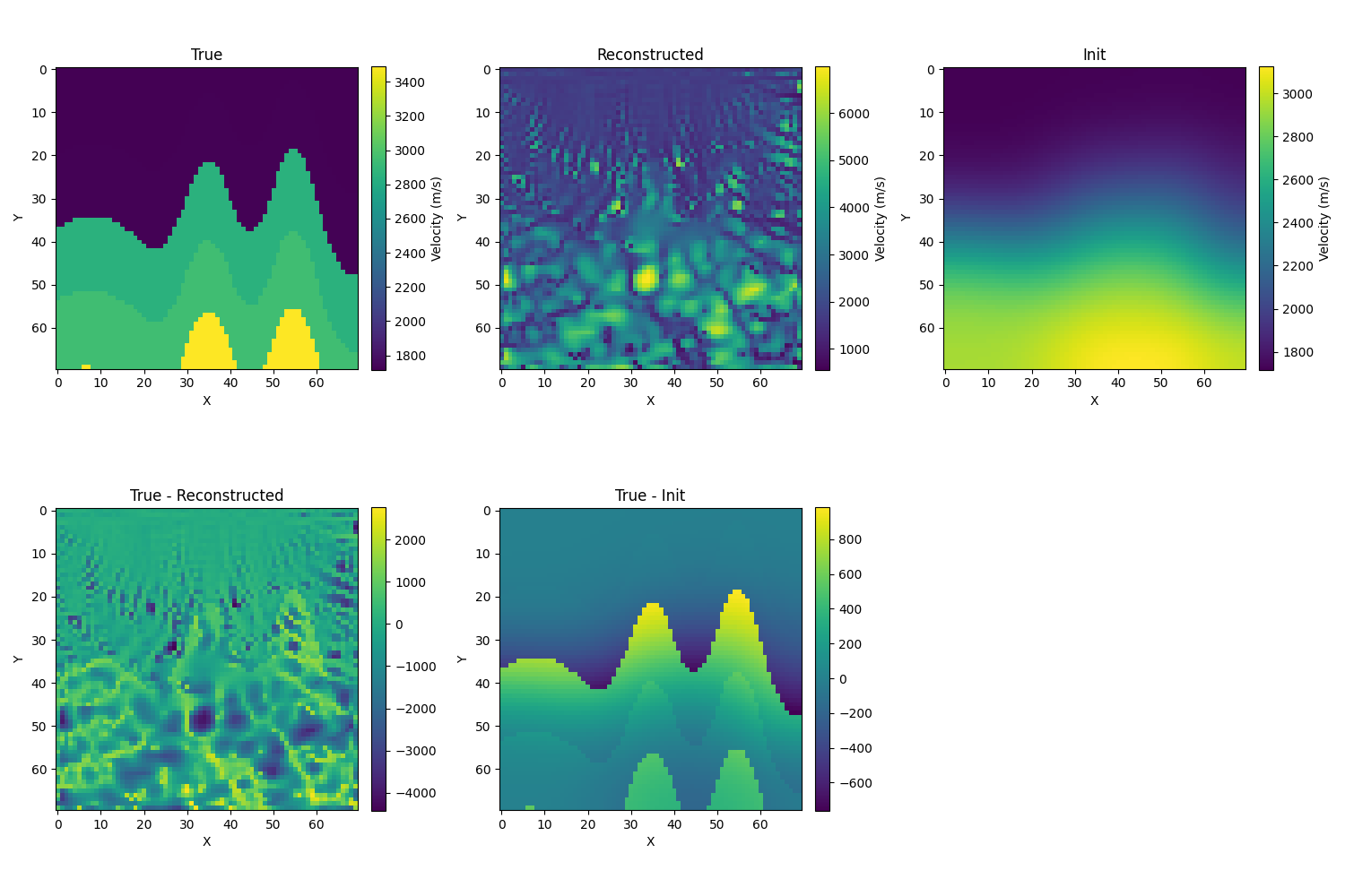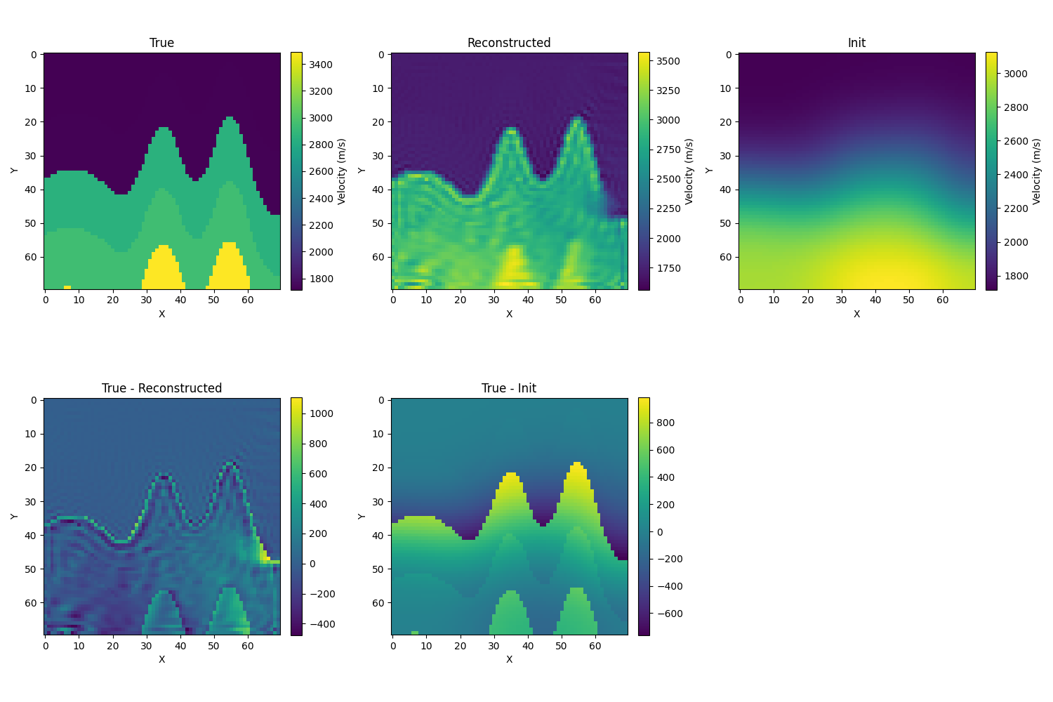 这时我们就能明显地看到半收敛性现象了(当上面的σ较大时,也会出现相对误差不降的现象)> deepwave的建议是一个完整波形的长度至少需要6个网格点,否则可能无法准确模拟波形。根据波长=速度/频率,速度太小时,波长也会相应的小,所包含的网格点也就少,所以会出现上面的问题。此时在物理上无法进行有效的模拟2. SGD:结果有点amazing,相对误差几乎不带降,也就是基本没做移动(这里我学习率设置为50),把学习率调到5000,loss开始降了,但相对误差几乎不变(应该是在局部极小点附近了)