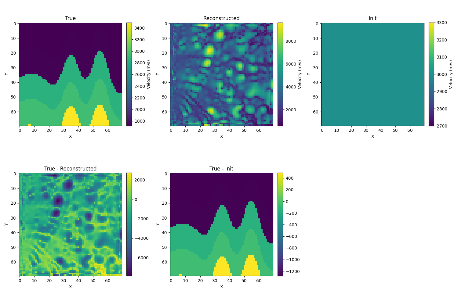 - 初始化为真解的模糊化,取σ=10,初始相对误差为12.1%,迭代的结果如下,相对误差为8.8%,比震源和接收器都在左侧高。本来以为应该是比都放在左侧简单的,但实验结果好像不是这样的,并且出现了半收敛性?